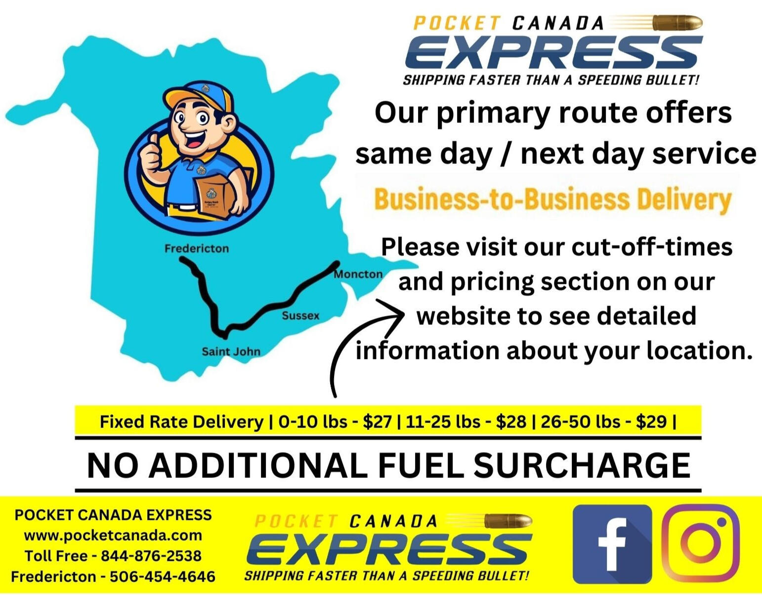 Beyond our primary route which is what we are known for, we also use a network of the best shipping services available today to offer you additional shipping options for most locations in New Brunswick and the rest of Canada.To learn more about how our system works please contact our partner