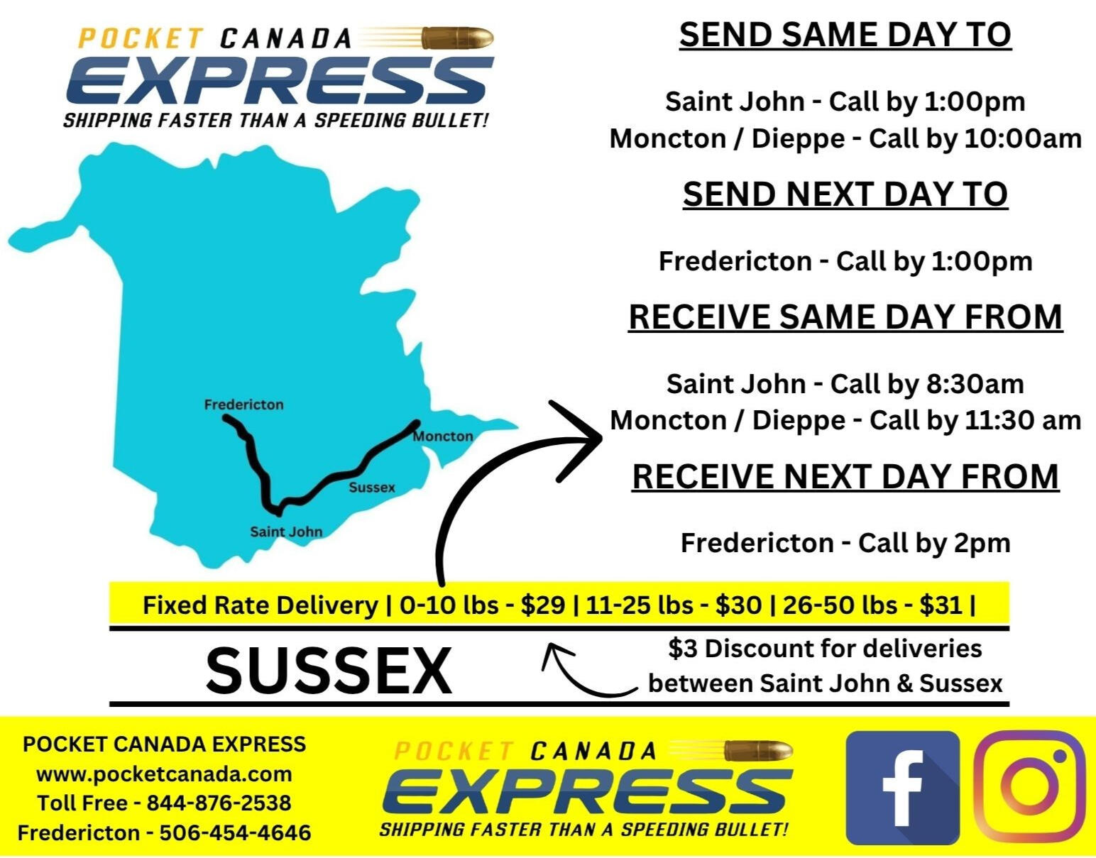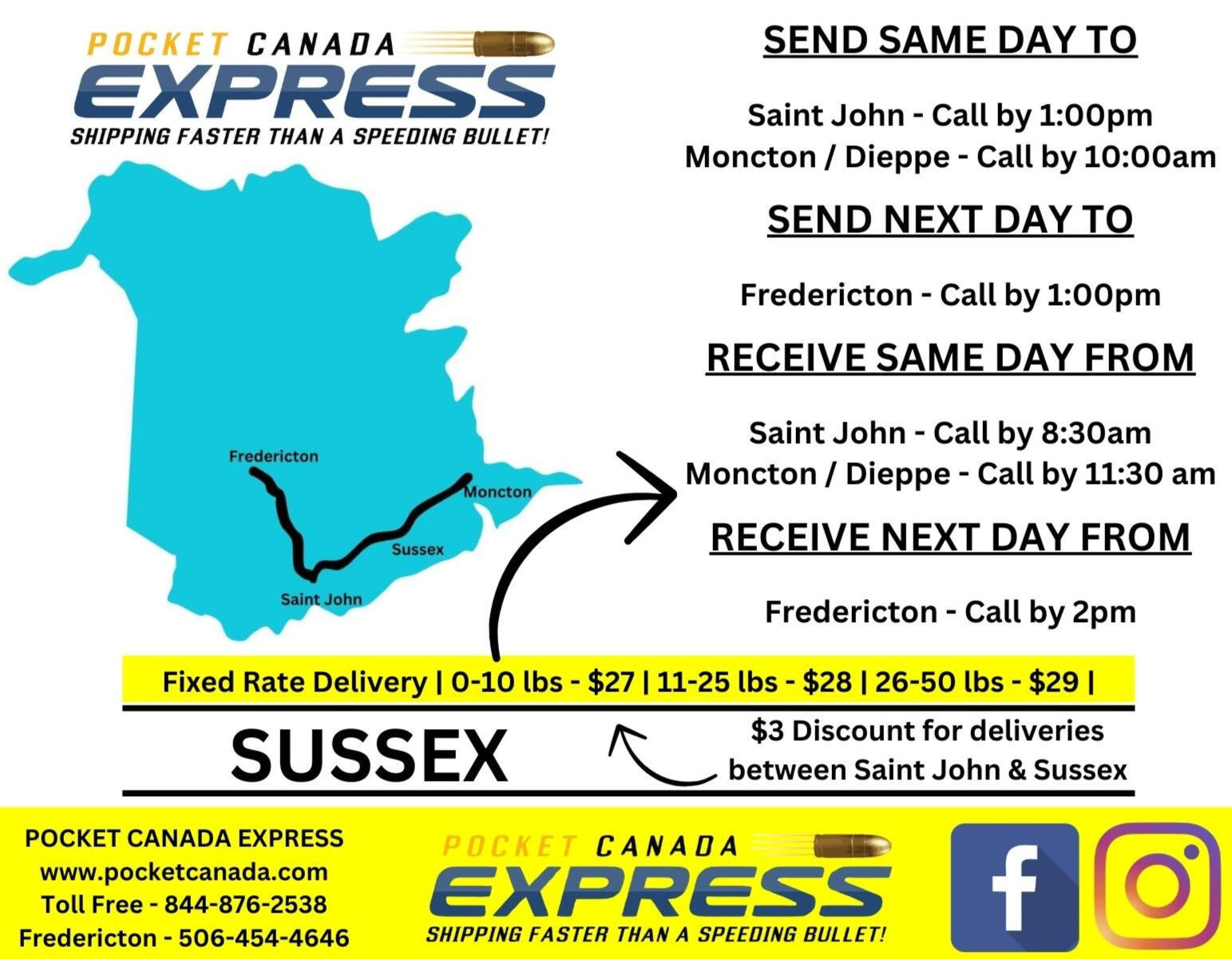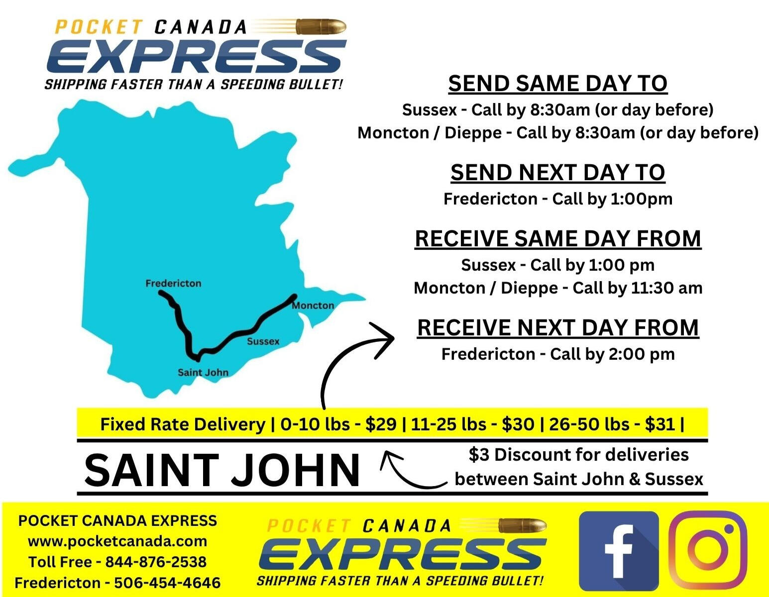 Beyond our primary route which is what we are known for, we also use a network of the best shipping services available today to offer you additional shipping options for most locations in New Brunswick and the rest of Canada.To learn more about how our system works please contact our partner