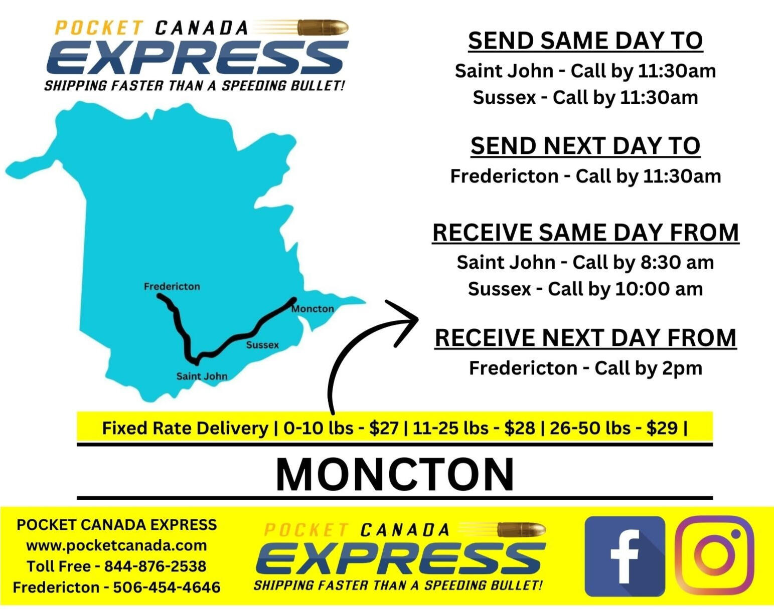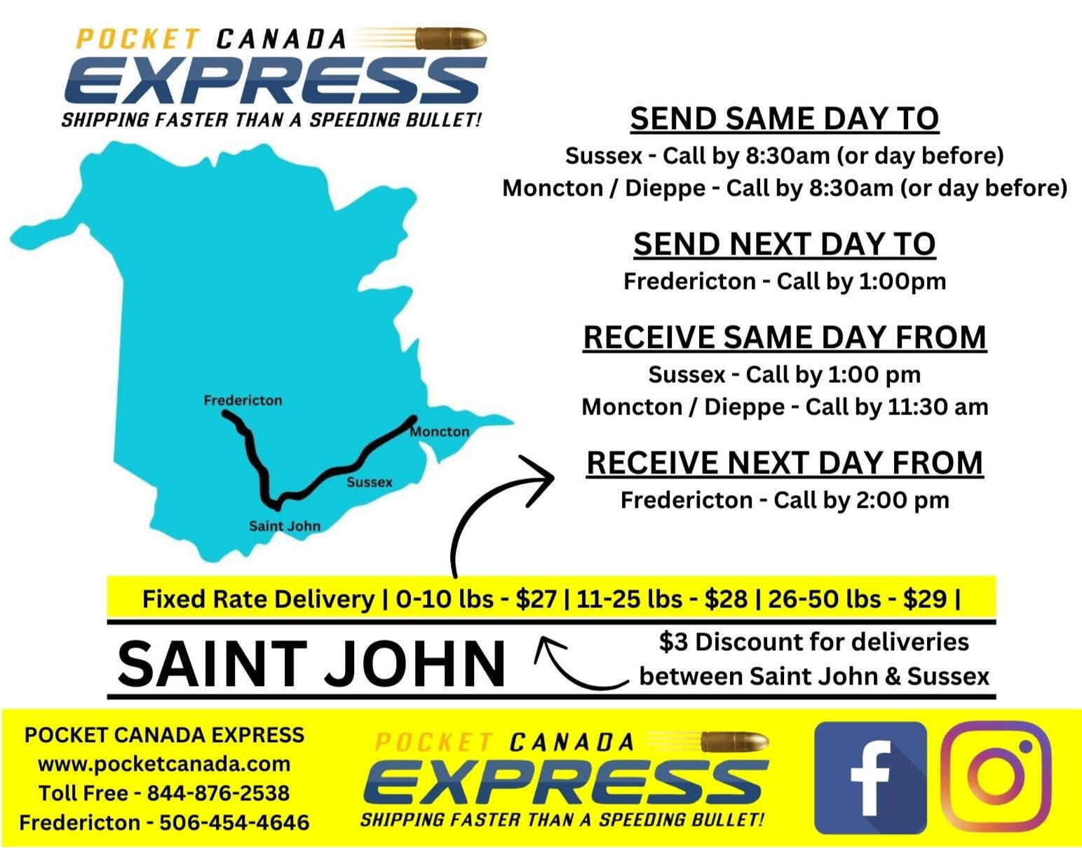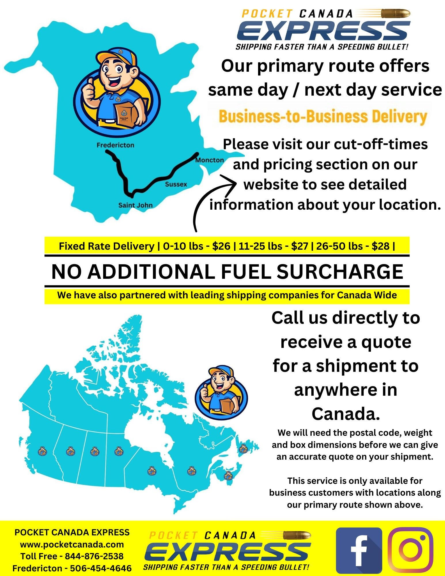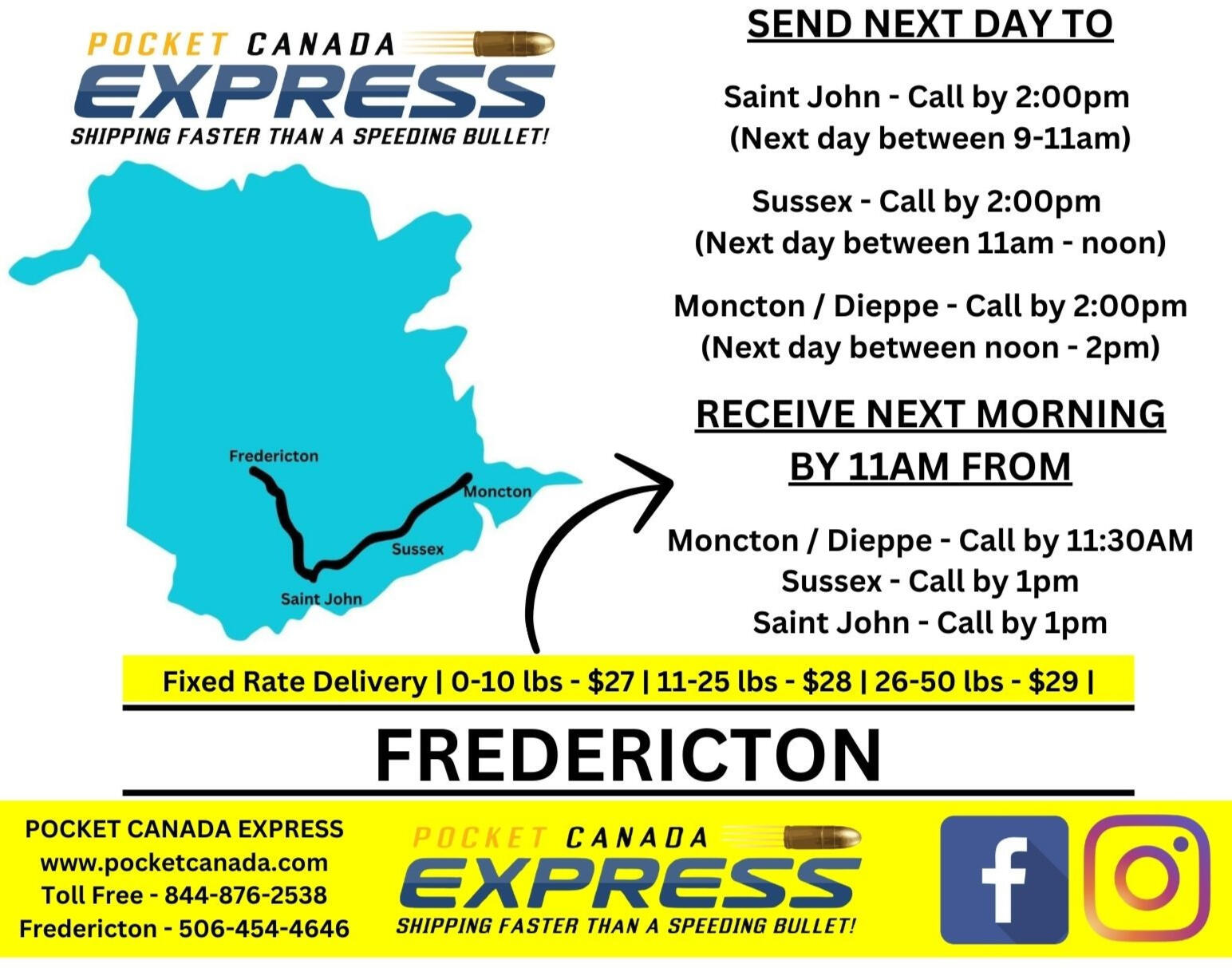 Beyond our primary route which is what we are known for, we also use a network of the best shipping services available today to offer you additional shipping options for most locations in New Brunswick and the rest of Canada.To learn more about how our system works please contact our partner